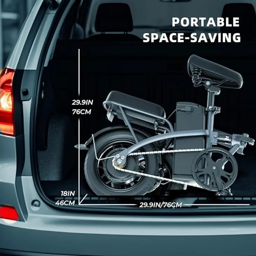 【Foldable Electric Ebike】 The foldable electric bike lightweight design and foldable design enhance portability. Folding size 29.9*29.9*18 inches. Made of high-carbon steel frame, very strong. Weight is 55.56 lbs. The small electric bike can be easily put into car trunk, subway, bus, apartment, office. Mini electric bikes are great for riding to shopping, camping and anywhere