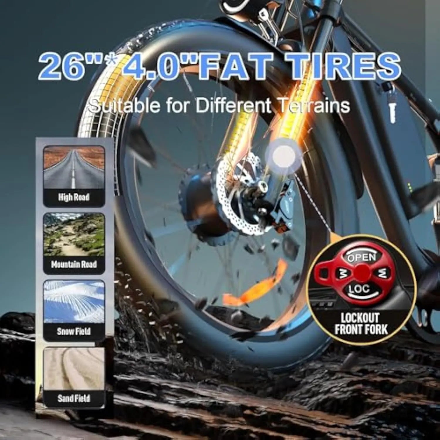 【Lockout Front Suspension】the e bike for men features a lockout front fork and saddle with springs. it helps absorb vibrations and shocks from uneven ground, making you more comfortable in the saddle. in the meanwhile, it increases traction, which gives you greater control and helps you enjoy a safer rider.