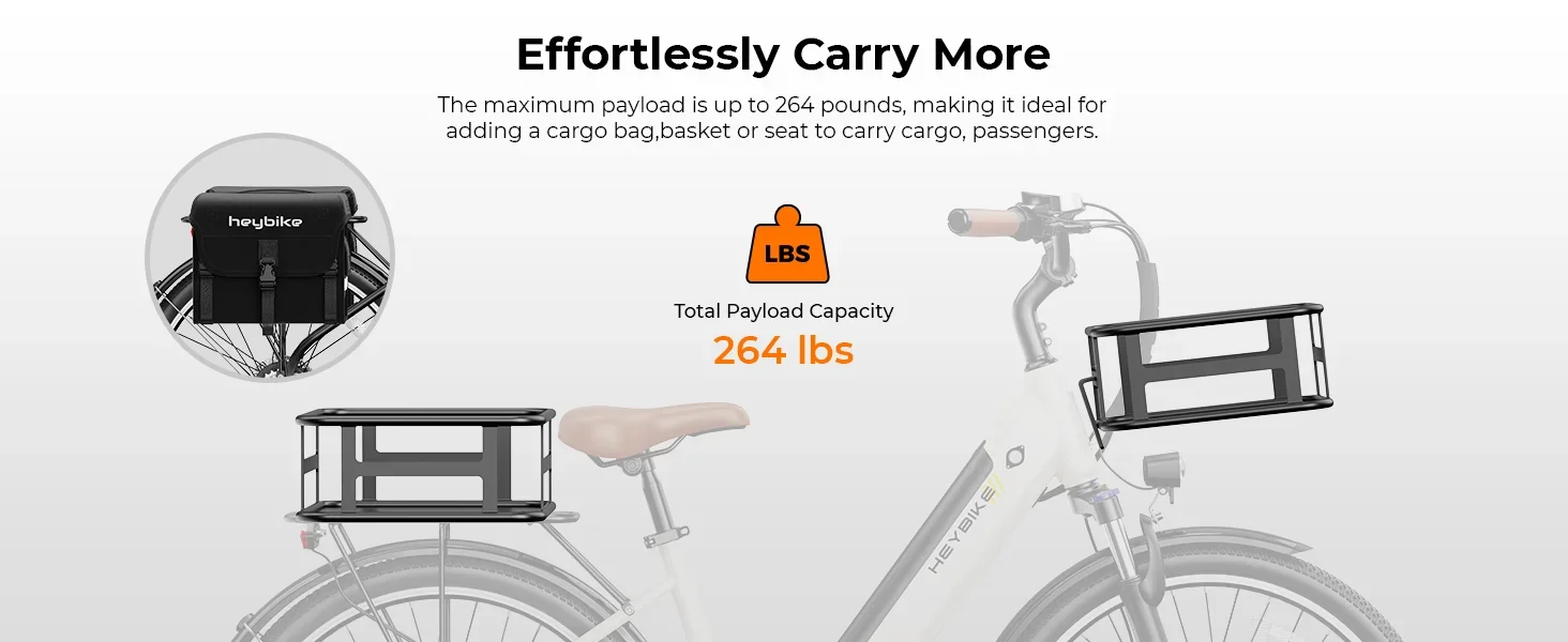 Sturdy Rear Rack-The 264 lbs load capacity adds more flexibility and convenience to your riding life, allowing you to carry items effortlessly and roam freely.