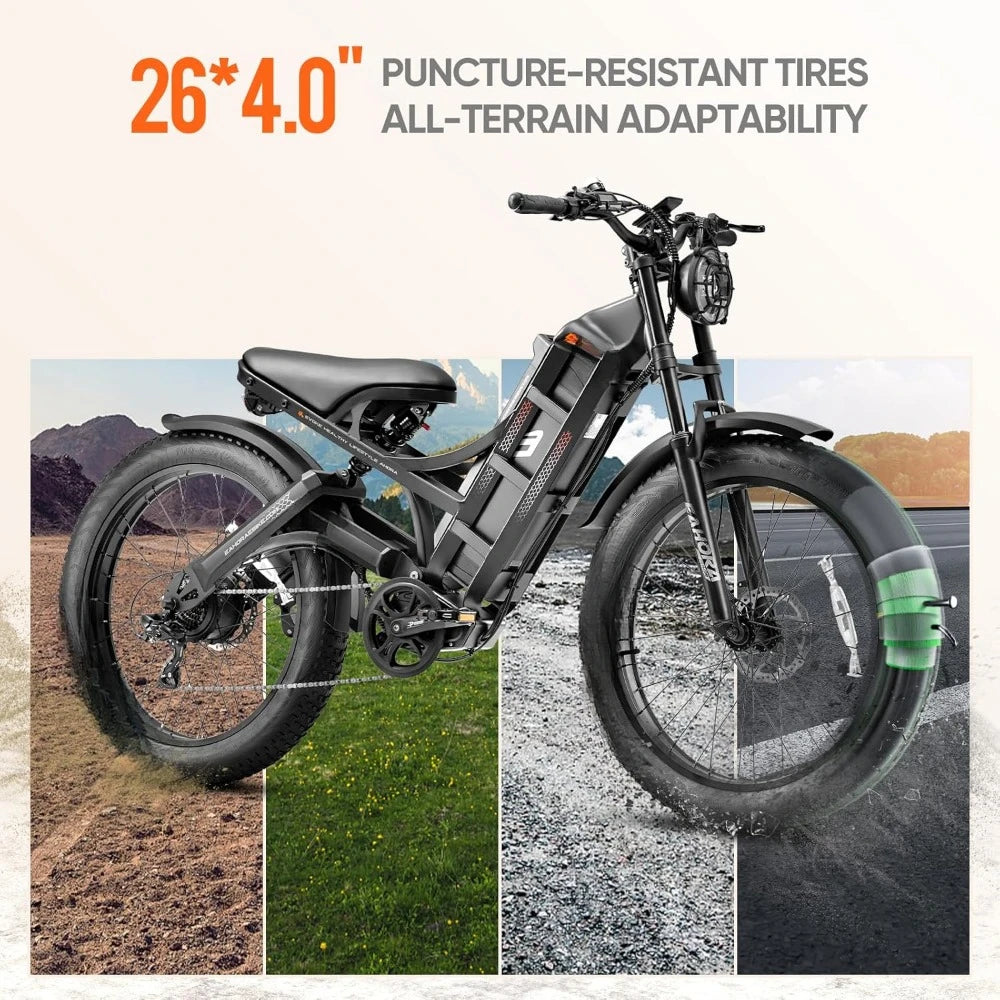 - [๐๐๐ฉ๐ ๐ซ๐๐๐๐ ๐๐จ๐ฐ๐๐ซ๐๐ฎ๐ฅ ๐๐จ๐ญ๐จ๐ซ] Optimized the 1200w(Peak 1600W) motor and 30A controller. Updated internal wiring for more efficient control.โคThe 26" Fat Tire Electric Bike can hit 29-34mph, 90-120 torque.You'll be amazed how easy that steep climb is, how fun it is to go places you were never able to before.