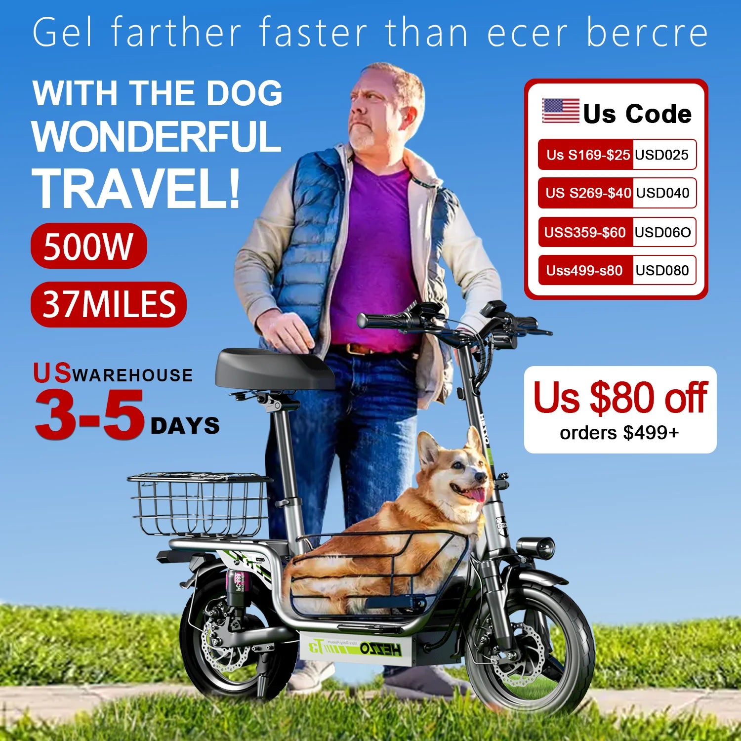 48V 500W Carbon Steel Ebike Electric Bike Multi-Shock Absorption City Commuter Adult Electric Bicycle 14"Road tires With Basket