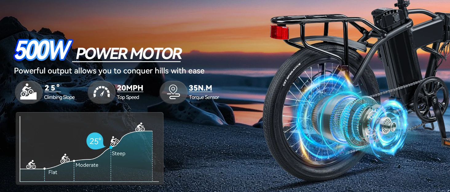 Unleash the power of a 500W motor that delivers rapid acceleration, smooth hill climbing, and a max speed of 20 MPH. Whether you're commuting through the city or venturing off-road, this foldable electric bike ensures a dynamic and reliable ride every time.