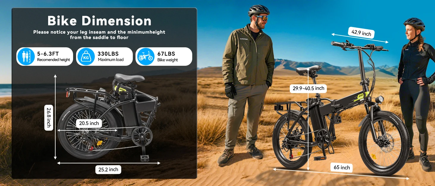 Designed for portability, this folding e-bike measures 38.98 x 17.72 x 26.77 inches when collapsed and weighs just 67 lbs. It supports up to 330 lbs and features an adjustable seat to accommodate riders of all sizes. Ideal for both men and women, it's perfect for commuting, road trips, or storing in tight spaces.