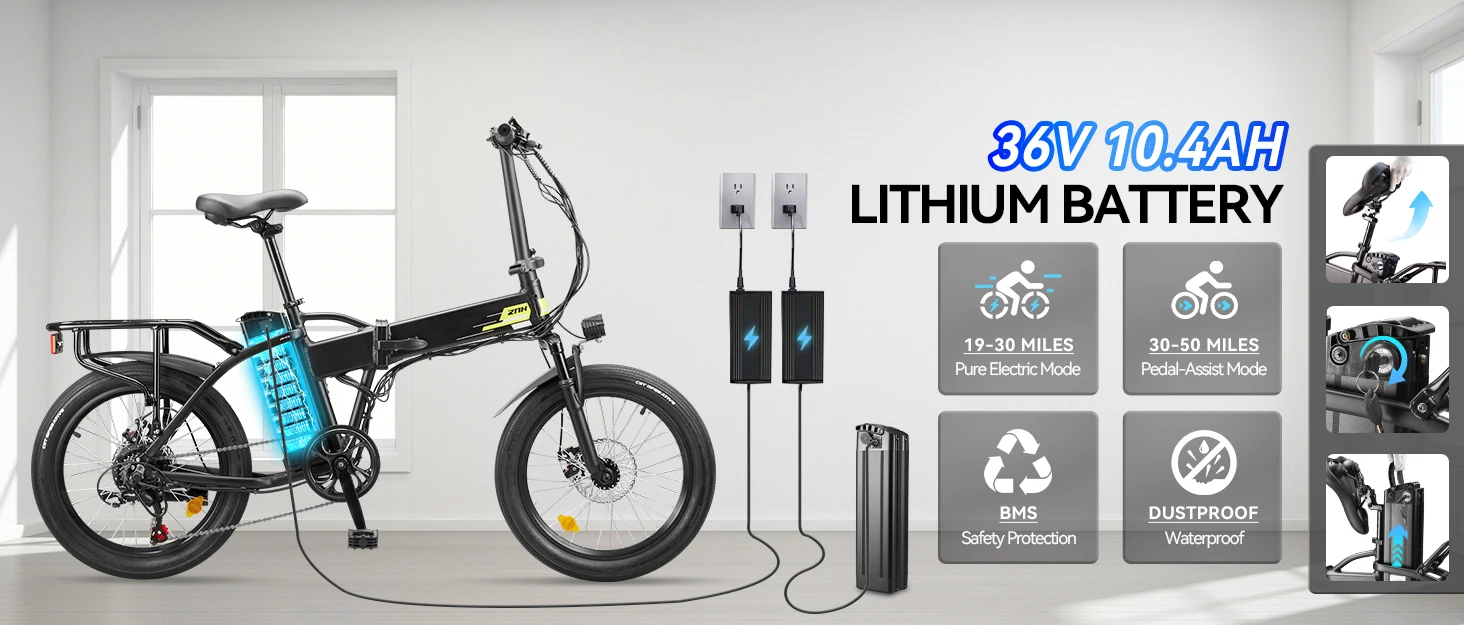 Ride farther with the 36V 10.4Ah lithium battery, offering up to 50 miles on a single charge. Switch between three modes to suit your journey: Pure Electric (19–30 miles), Pedal Assist (30–50 miles), and Pedal Only. The battery is detachable and secured with a dual-key system, while IPX4 waterproofing ensures dependable performance rain or shine.