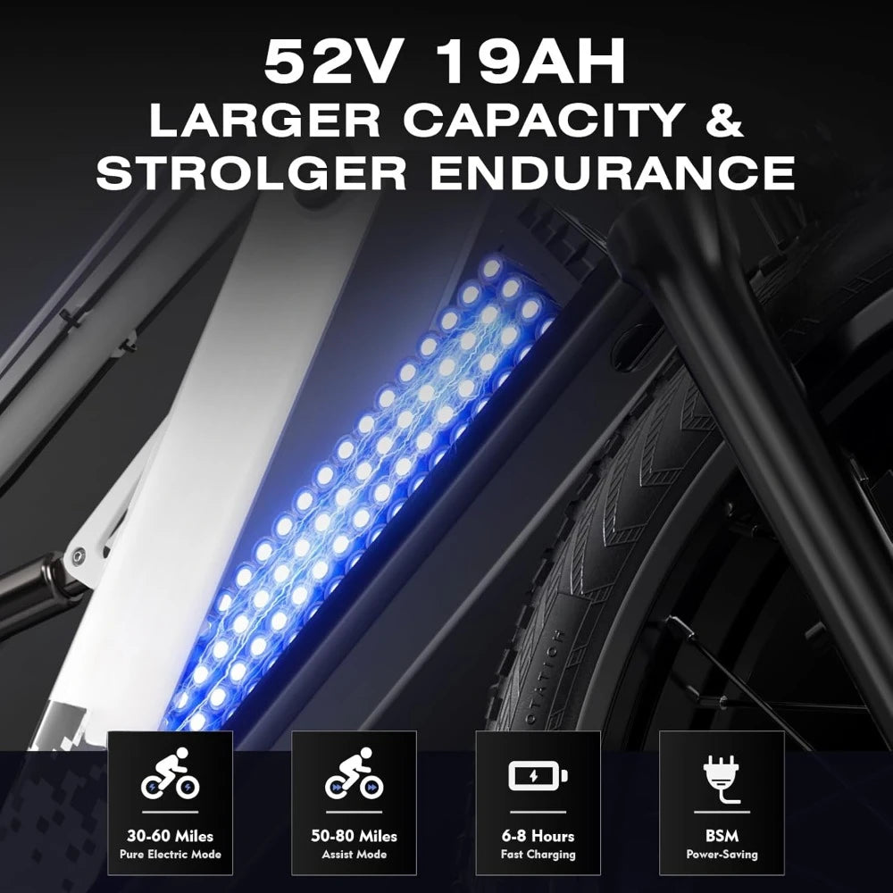 (Large-capacity 52V19AH Battery) The adult electric bicycle has a built-in large-capacity 52V 21Ah removable lithium-ion battery with a cruising range of 30-60miles. The mileage range depends on whether it is in pedal assist and pure electric mode. It takes about 6-8 hours to fully charge.