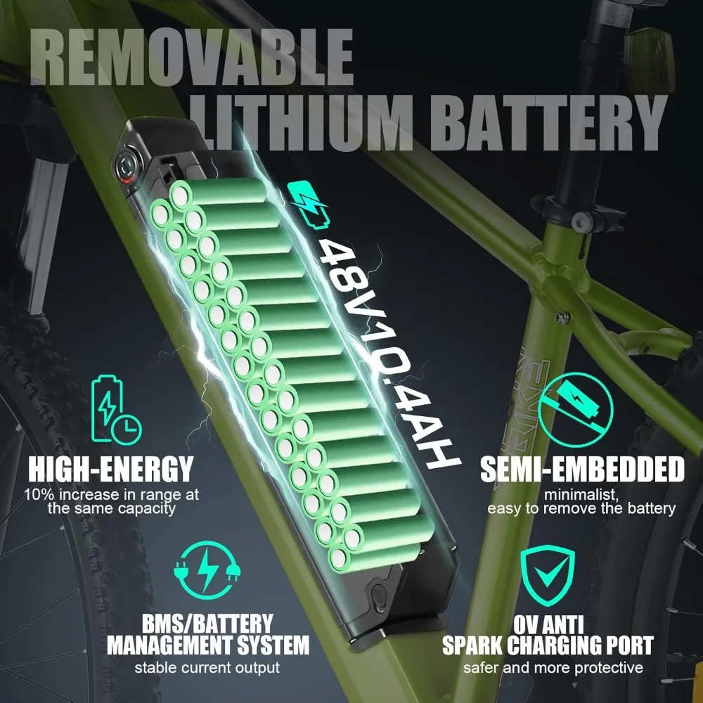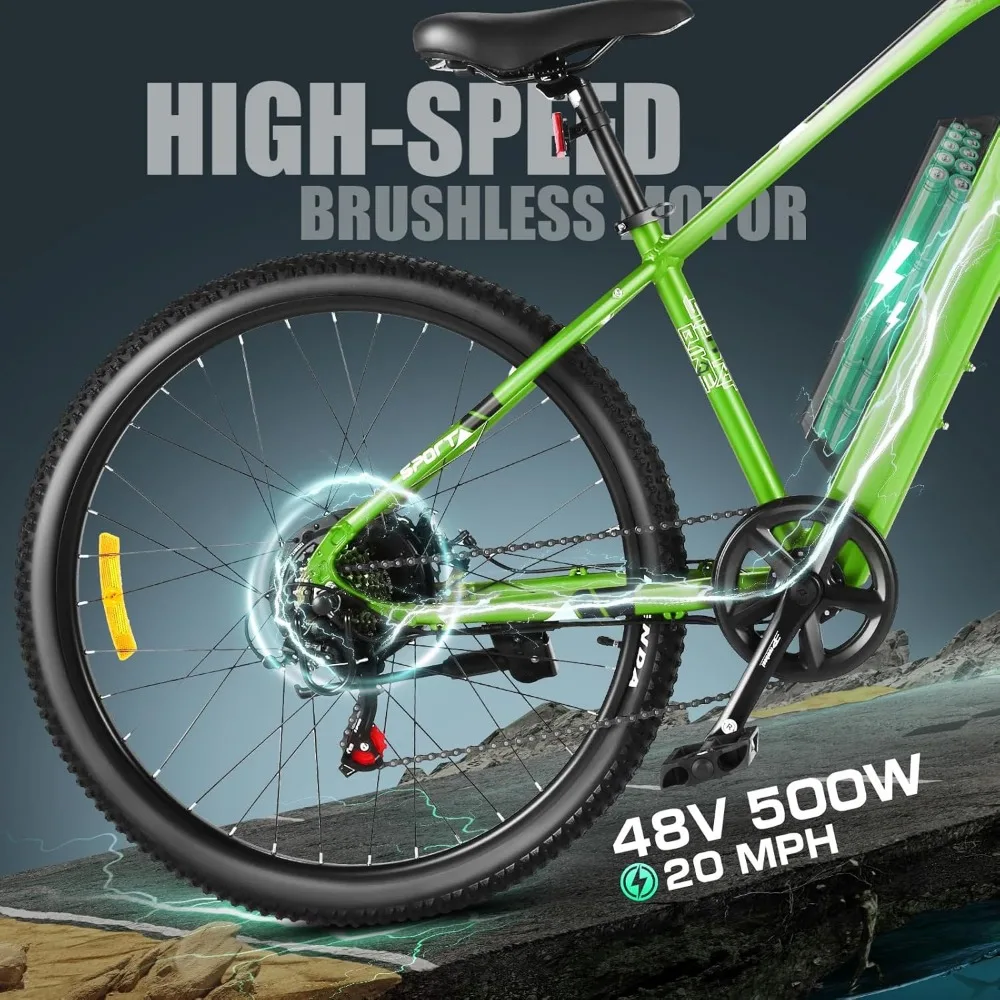 š² 500W (PEAK 750W) POWERFUL MOTOR & LONG RANGE: This electric mountain bike delivers up to 55 miles per charge, making it perfect for hitting trails and exploring backroads. Equipped with a 48V 500W hub motor, five pedal-assist levels, and a throttle, it's built for versatility. Plus, it comes with a dual-leg kickstand, and bright front and rear lights. With a top speed of 20 mph, you'll get where you need to go in no time.