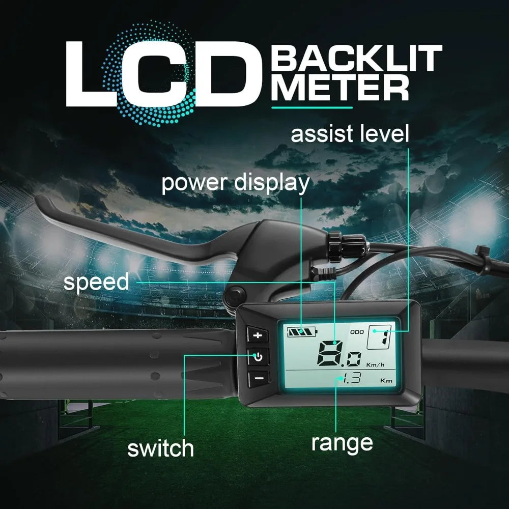 š“ ADJUSTABLE HEIGHT E-BIKE: This electric dirt bike features an adjustable seat, making it a comfortable fit for riders between 5'3" and 6'4". The bike weighs 55 lbs (including a 13-lb battery) and can support up to 265 lbs. Check out the description page for all the details!