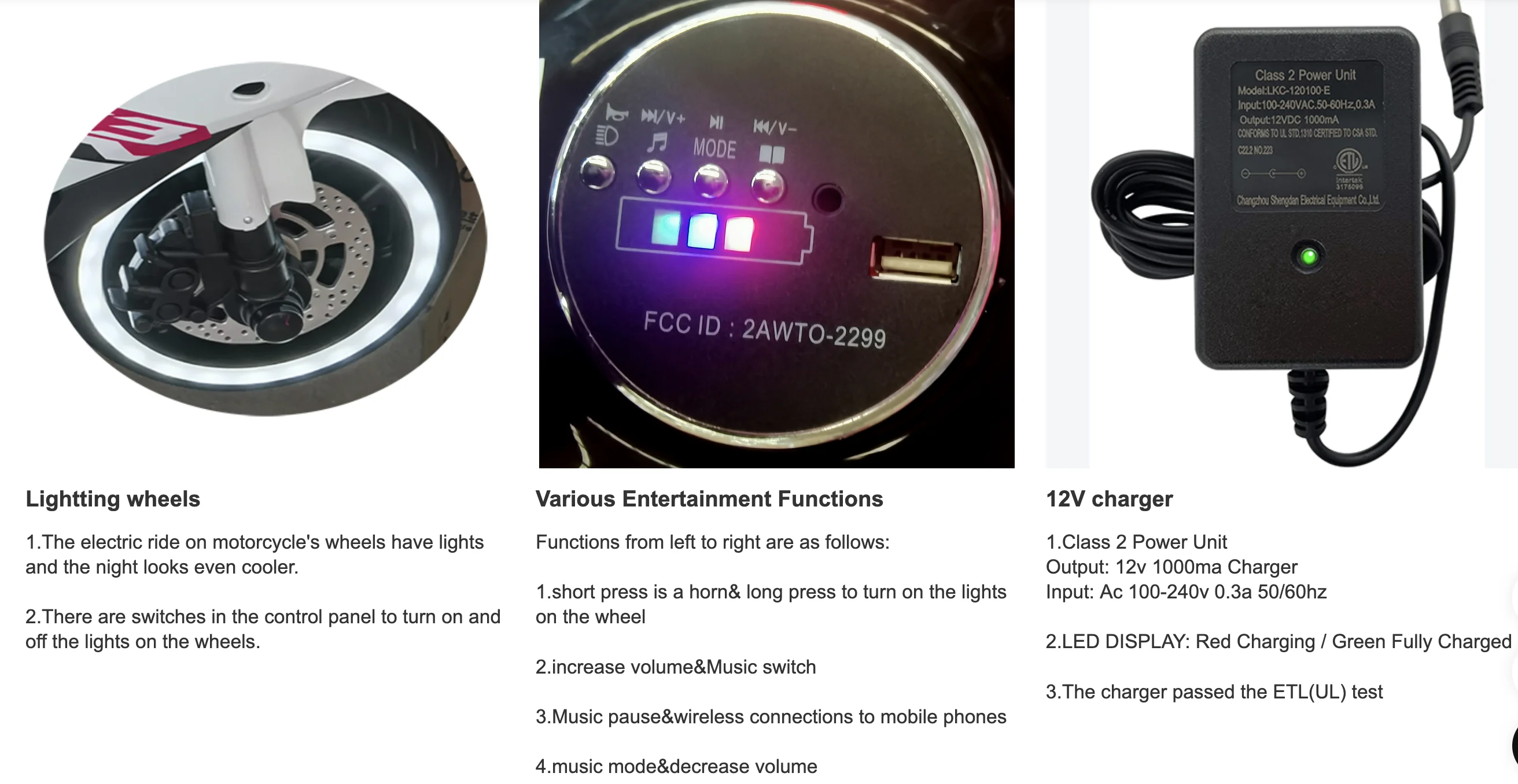 [Various Entertainment Functions]: kids motorcycle Built in stories and music And wireless connections to mobile phones,the kids ride on motorcycle combines educational and entertainment functions to furthest utilize the USB and MP3 port to while kids are driving. And headlight is capable of bringing bright in darkness. can exercise kids' hand and foot coordination and balance ability. It will be the best gift for child's birthday or Christmas.