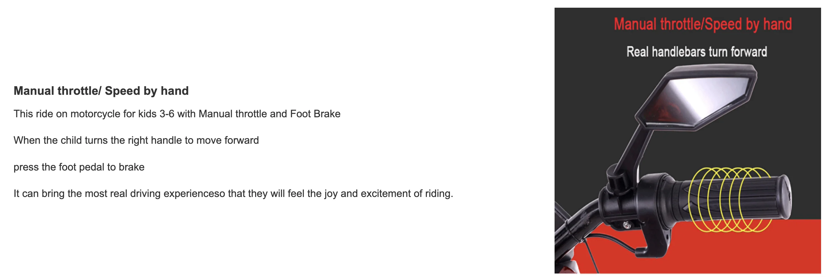 [Manual throttle]:this ride on motorcycle for kids 3-5 with Manual throttle and Foot Brake When the child turns the right handle to move forward and press the foot pedal to brake, can bring the most real driving experienceso that they will feel the joy and excitement of riding.