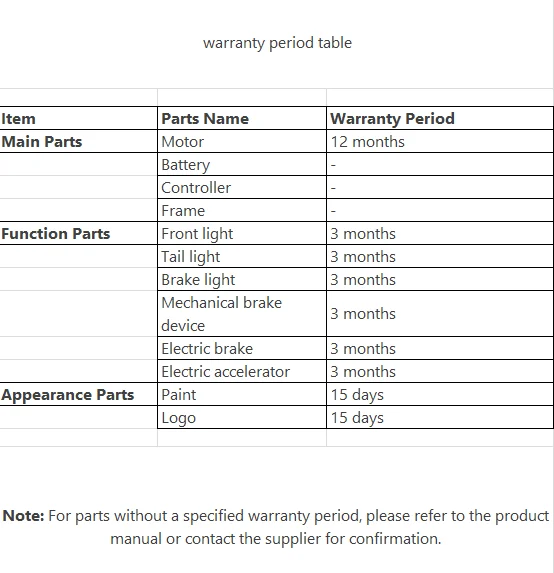 During the warranty period, the Seller will provide replacement parts free of charge, but the Buyer shall bear the repair costs. The warranty period for the product is as follows: