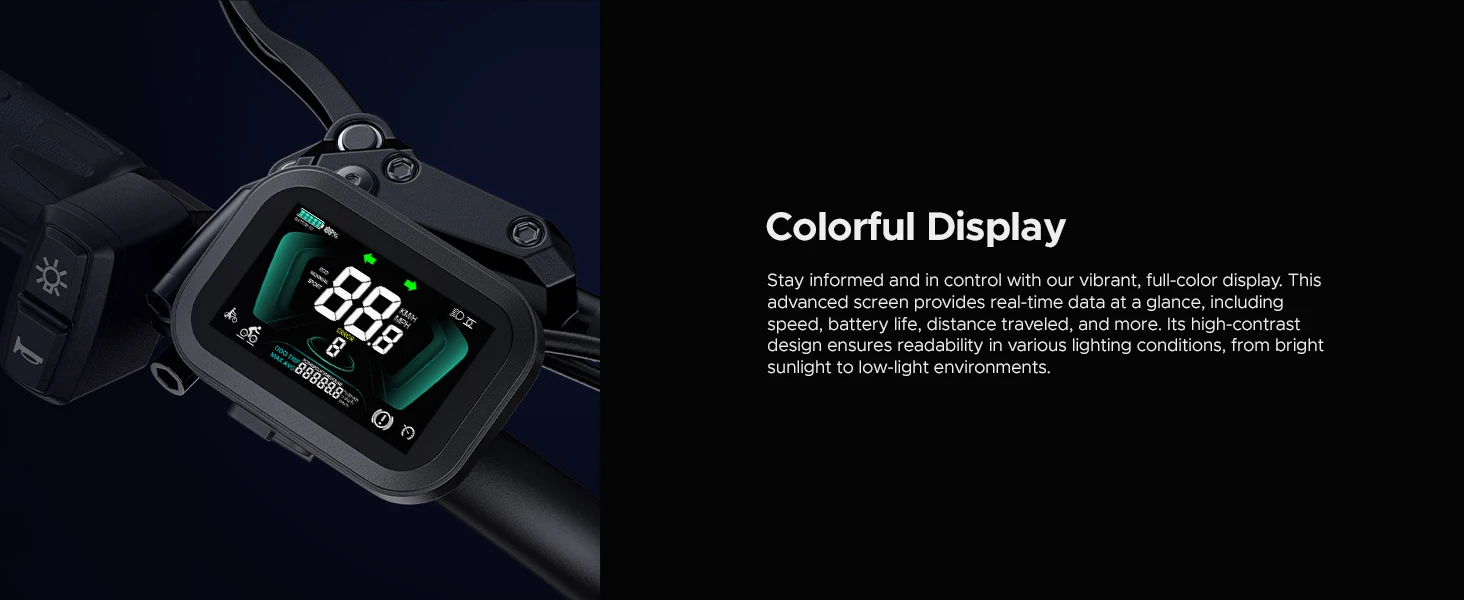 LCD Display, Mechanical Suspension, All-Terrain Tires |