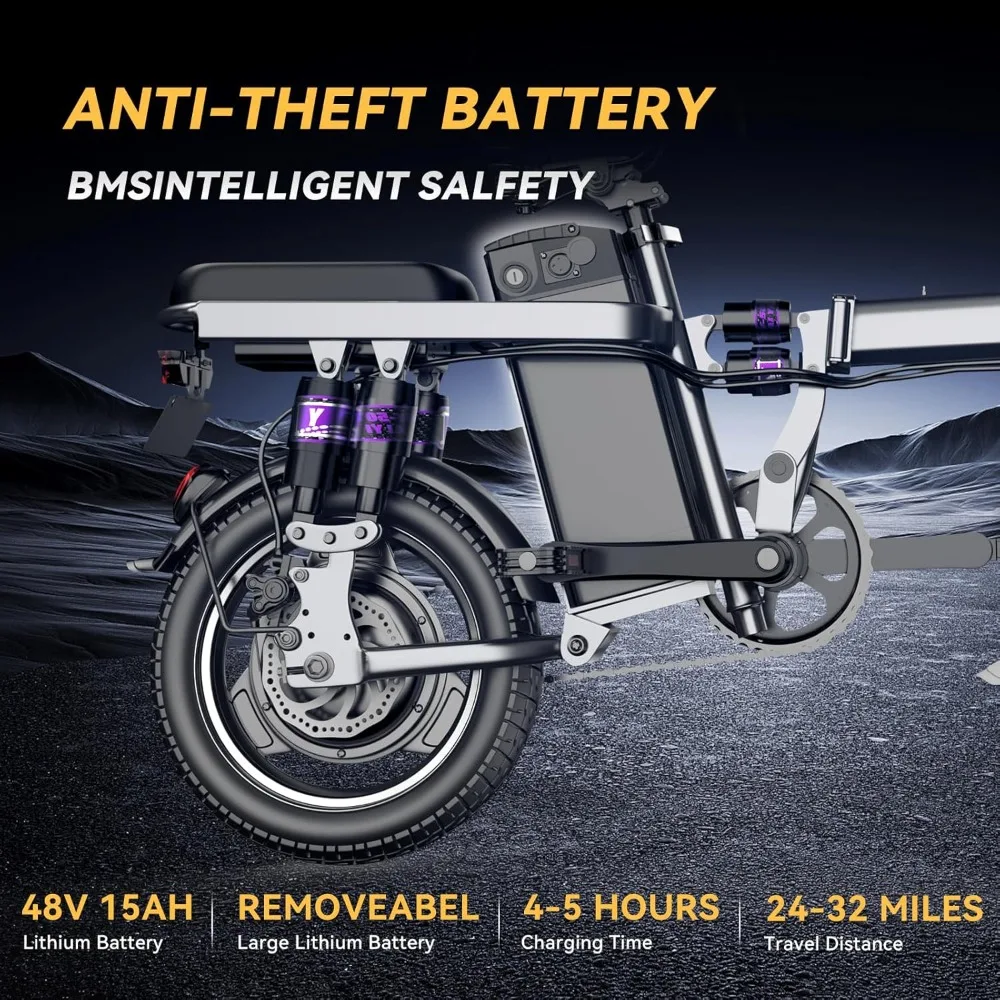 🔋【High-Capacity Lithium-Ion Battery】The battery shows off a pull-out design for flexible charging. Weighing only about 3.5kg, this removable battery of long life is perfectly placed under the seat of the foldable electric bike. 48V 15Ah of abundant power brings long-lasting and powerful energy output, with an electric range of up to 30 miles so you can travel freely and explore impromptu journeys to your heart's content.