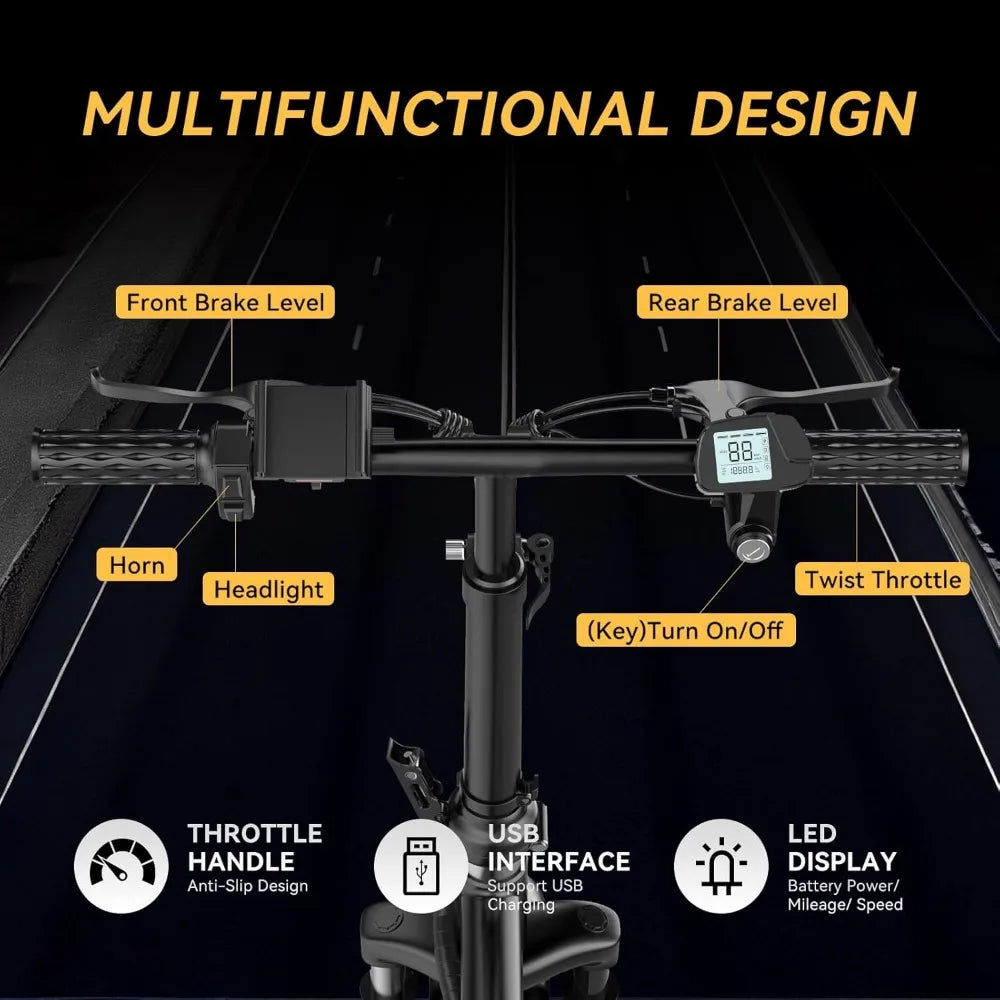 🚴【Foldable & Convenient Design】electric bike is designed to be foldable. It measures 27x17x26 inches folded and weighs just 66 pounds, and the seat and handlebar can also be height-adjusted to everyone's preferences. The whole bike can be folded in three places, stretching freely and easily fitting into the trunk and in and out of the elevator, showing off its static mechanical art. Handling this bike for city commuting, outdoor leisure, sports, and fitness is easy.