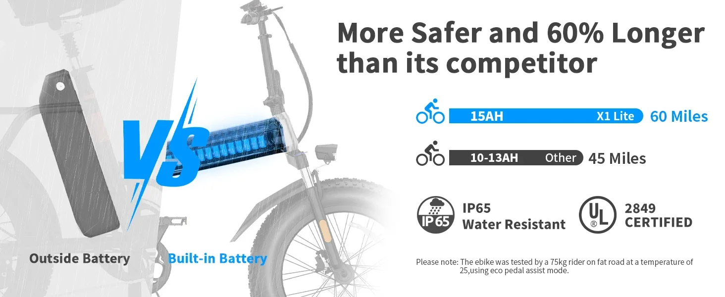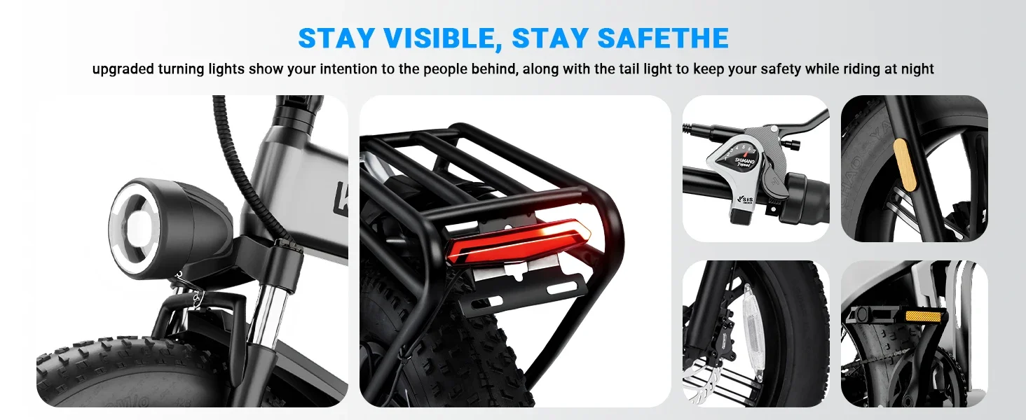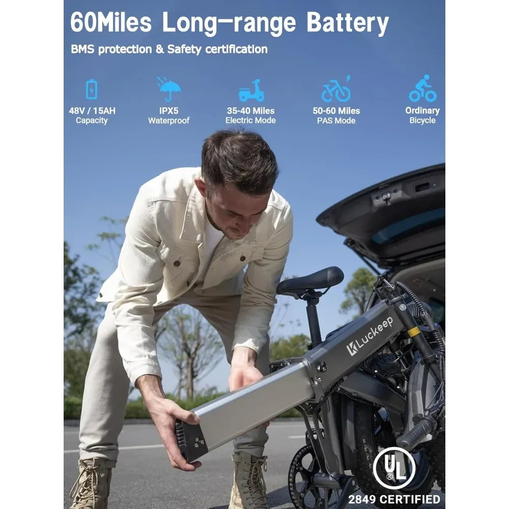 POWERFUL ELECTRIC BIKE 1200W PEAK: The high-speed brushless motor provides powerful and efficient assistance, allowing you to easily tackle various terrains such as beaches, mountains, snow, and city streets and ride longer distances. Reach up to 28MPH Max speed and 85N.m torque. ebike have obtained various international safety certifications, including UL 2849 certified. The safety and quality are guaranteed, so feel free to use them.48V/15AH (720WH) LITHIUM-BATTERY: Enjoy long-distance riding with the 48V 15Ah lithium-ion battery, allowing for up to 60 miles on pedal assist mode per charge for 5-6 hours. The bicicleta eléctrica is equipped with the BMS system that provides 14 types of protection, making our battery safer and more cycle life. E bike have two charging methods, remove the battery to charge or directly charge the bike, perfect for your daily commute or travel.NFC MULTIPLE WAYS UNLOCK & 4 RIDING MODES & ANTI-THEFT: Unlock your foldable ebike effortlessly with our advanced NFC technology – compatible with smartphones, smart watch, and other NFC devices. Say goodbye to lost keys! Switch between 4 riding modes (Cruise, Pure Electric, PAS, and Regular Bike) with 5 Assistance Levels for tailored support. Cruise Control and twist throttle help manage speed effortlessly for the smoothest ride, and the anti-theft system deters theft.Rider Height: 5'4"-6'4".ENSURE MORE COMFORTABLE RIDE: The sturdy 6061 aluminum geometry & folding unibody frame, professional 7-speed shift gear, and LCD intelligent display all work together for an outstanding riding experience. The dual mechanical disc brakes offer reliable stopping power in any weather condition, and a high-strength carbon steel front fork with rebound and lock functions, bumps will no longer be an issue, even the taillight design with turn signal also considers rider safety.FAT TIRE FOLDABLE E-BIKE-All-TERRAIN : The folding electric ebike 750w is convenient for you to take anywhere. With a folded size of 39.4*21.7*30.7 inches, It can be easily folded and stored in the trunk of a car or subway. Conquer any terrain with ease with our fat tire electric bike' durable CHAOYANG non-slip 4-inch fat tires, designed to withstand wear and tear while providing optimal traction on sand, snow and mountain paths.