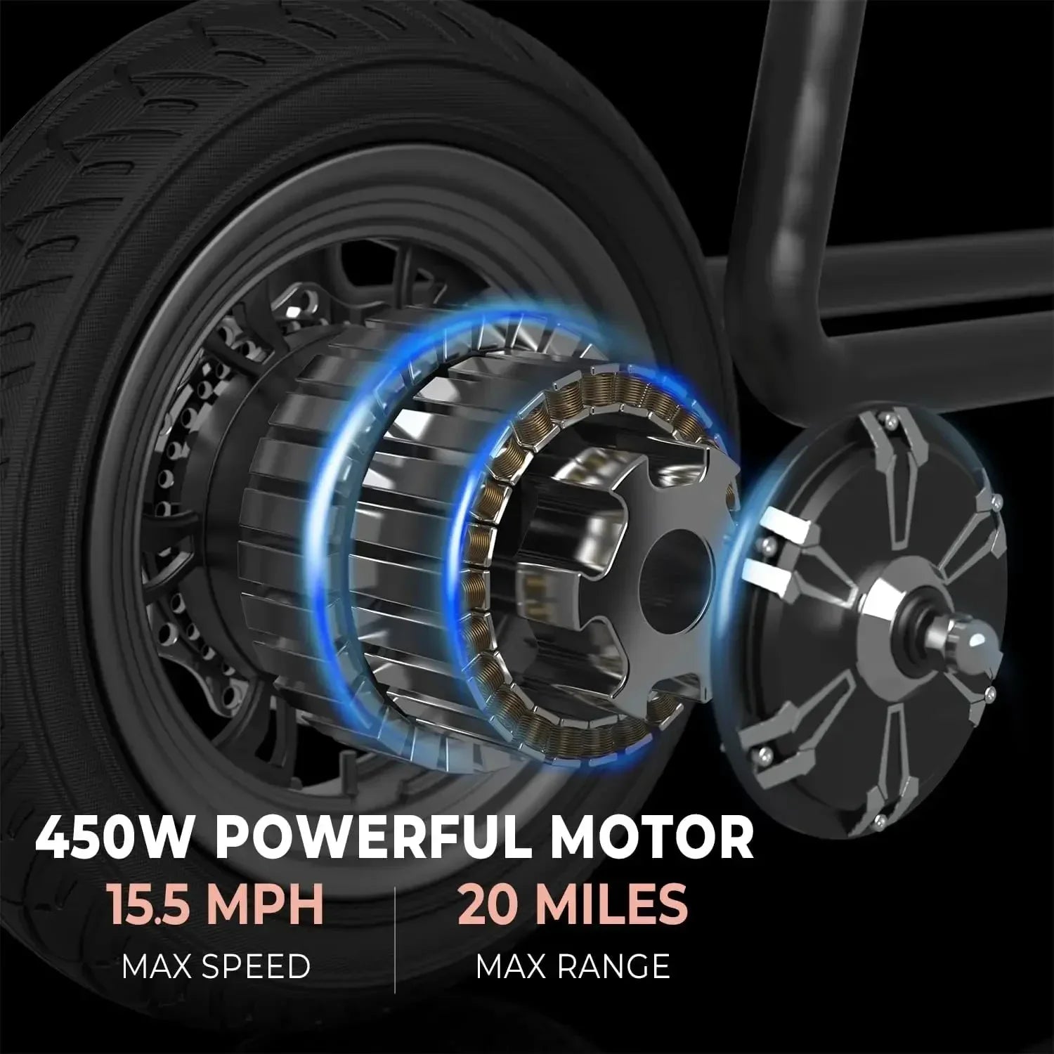 MOTORIZED SCOOTER: 450W Brushless electric motor scooter with 20-mile range and max speed of 15.5 mph