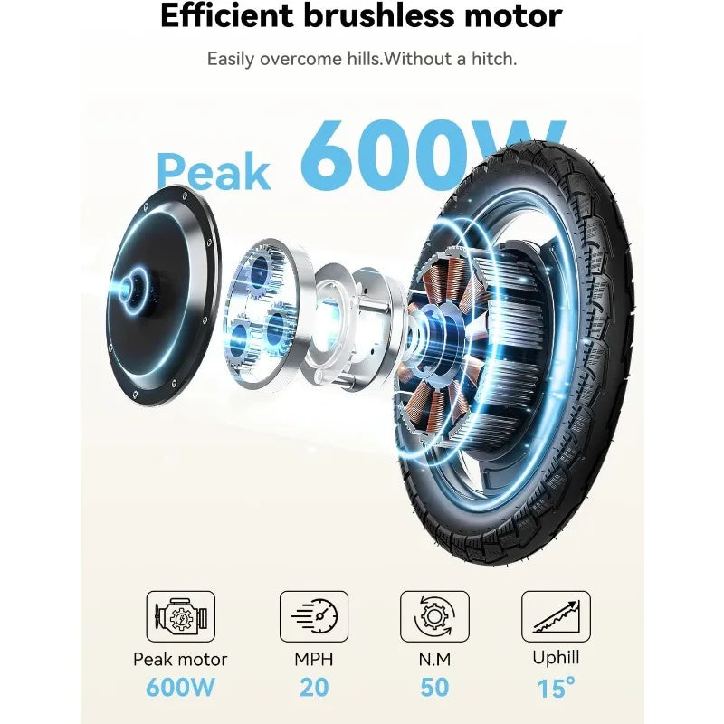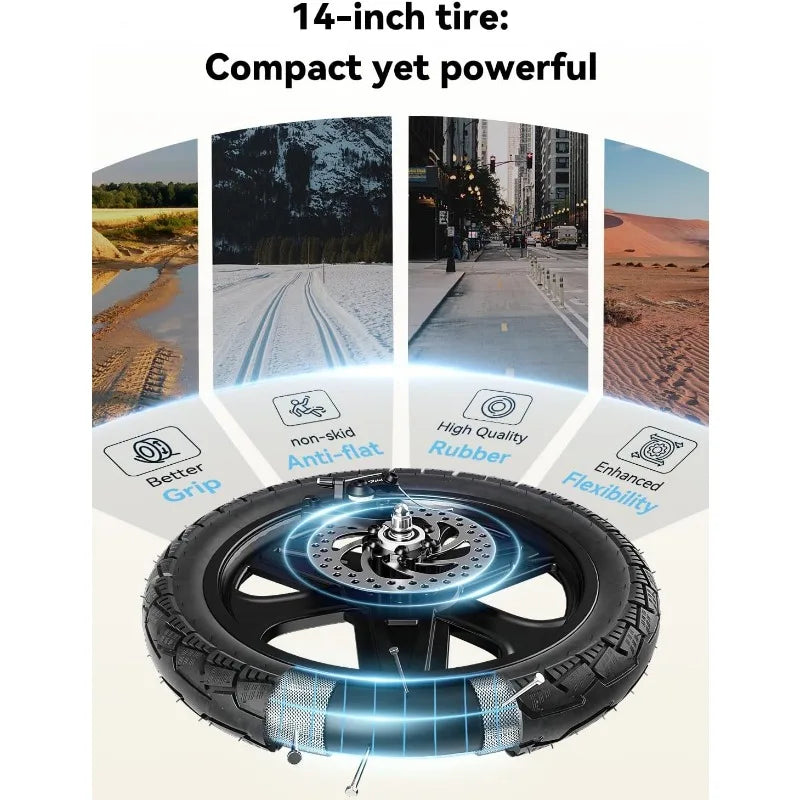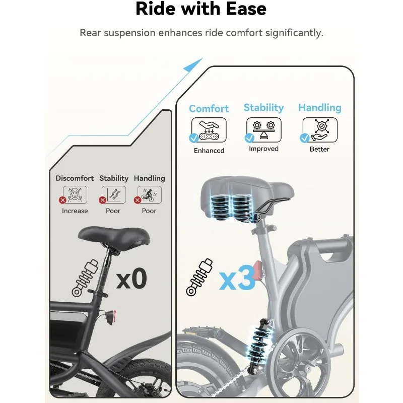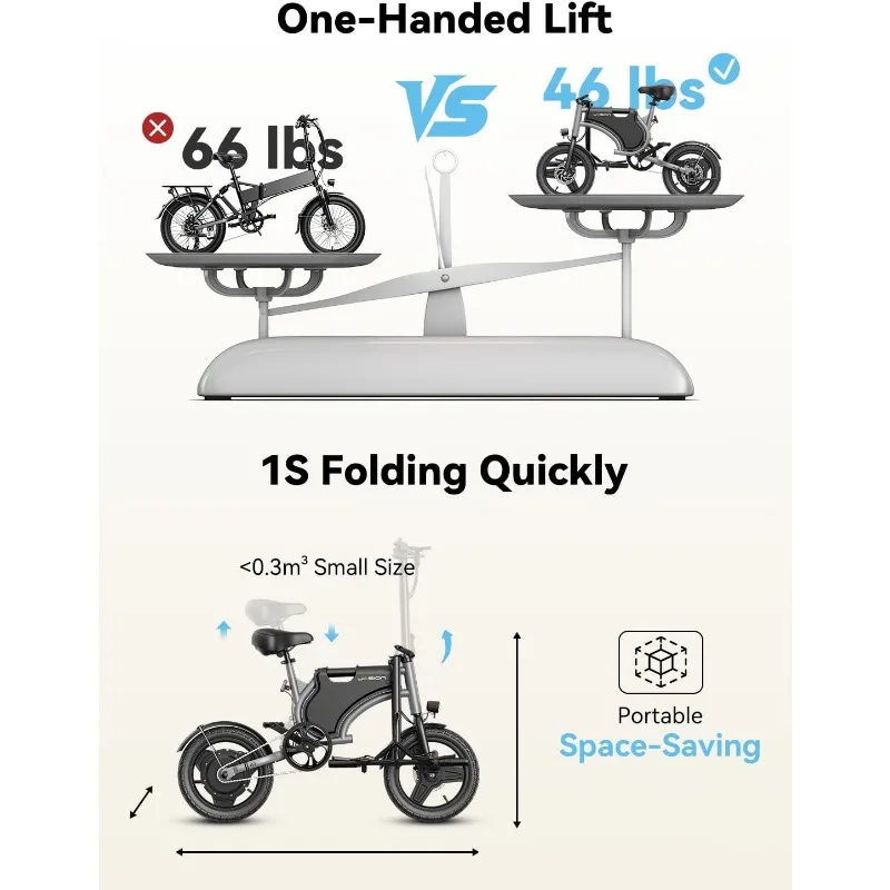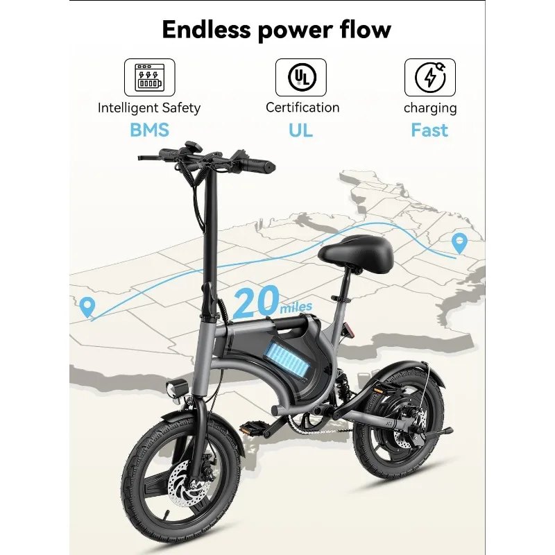 - 【Portable & Comfortable Design】The electric bike is made of aluminum alloy, 14 inches folding, and can be placed in the car's trunk. Adjustable seat and handlebars, and ergonomic seat design, provide a comfortable riding experience. Whether it is men, women, retired people, students, or office workers, they can easily enjoy the convenience it offers for travel, delivery, school, commuting, etc.