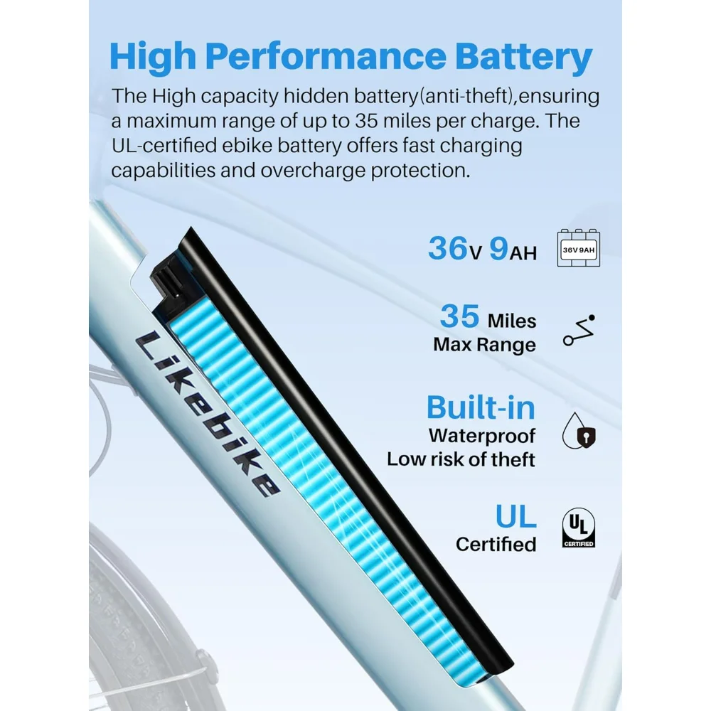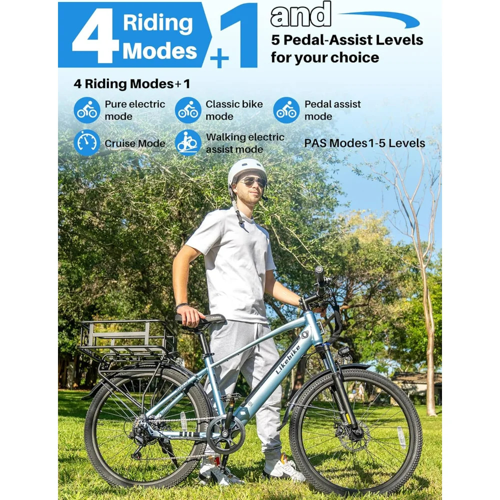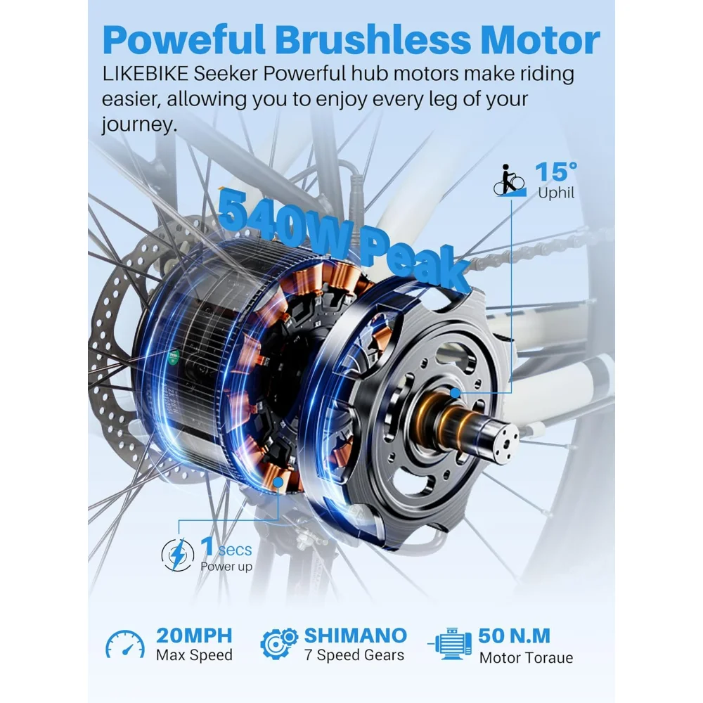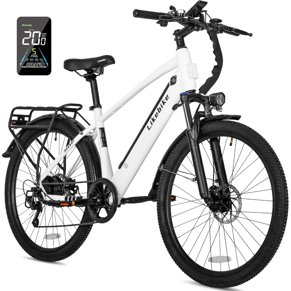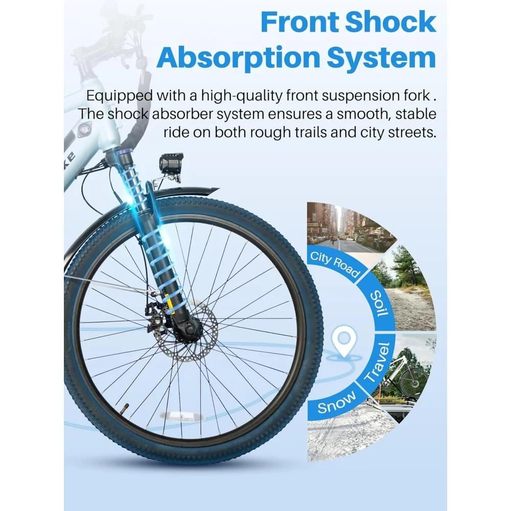 Frame Design: The classic geometry frame provides a stable and secure ride, ensuring a comfortable experience for you.(net weight of 58LBS, maximum load capacity of 330LBS). The detachable semi-hidden battery design is not only more anti-theft, but also improves the water and dust resistance. The 324Wh (9Ah) lithium-ion battery has a range of 15 miles pure electric or 35 miles PAS range, making it ideal for daily commuting and recreational cycling. Powerful Riding Performance: Electric bike is powered by 350W(Peak 540W) brushless motor with max speed of 20MPH. Explore 3 riding modes for a fulfilling journey! Effortlessly cruise, exercise, or commute seamlessly – we have you covered. Select Pure Electric Mode, Pedal-Assist Mode, or ride like a normal bike, tailoring your mode to match the purpose of your journey. Personalized Cycling: Seeker ebike for adults equipped with an colorful LCD, which enables you to track your riding data effortlessly such as current speed, single ride mileage, total ride mileage, etc. You can customize the number of levels and the corresponding speed through the display. The bright headlight and flashable reflector provide more visibility in dark conditions, enabling you to see and be seen, and use electric horn to alert other pedestrians. Flexible Maneuverability: Seeker ebike for adults equipped with a series of protection devices for safe riding. The lockable front suspension absorbs any bumps or shocks encountered on the road. The front and rear power-off brakes are essential for quick and safe stopping, creating a hassle-free riding experience for you. In combination with 7-speed gear, you could discover more flexibility of quick climbing response and experience the ultimate electric mountain bike riding experience!